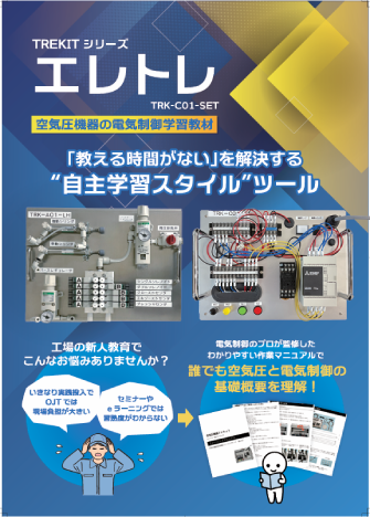 空気圧機器と電気制御の基礎がまとめて学べるトレーニングセットです。空気圧用トレキット TRK-A01-LH をベースに、空気圧の仕組みと各種コンポーネントの役割を理解し、そのまま接続して電気制御の実習に発展できます。