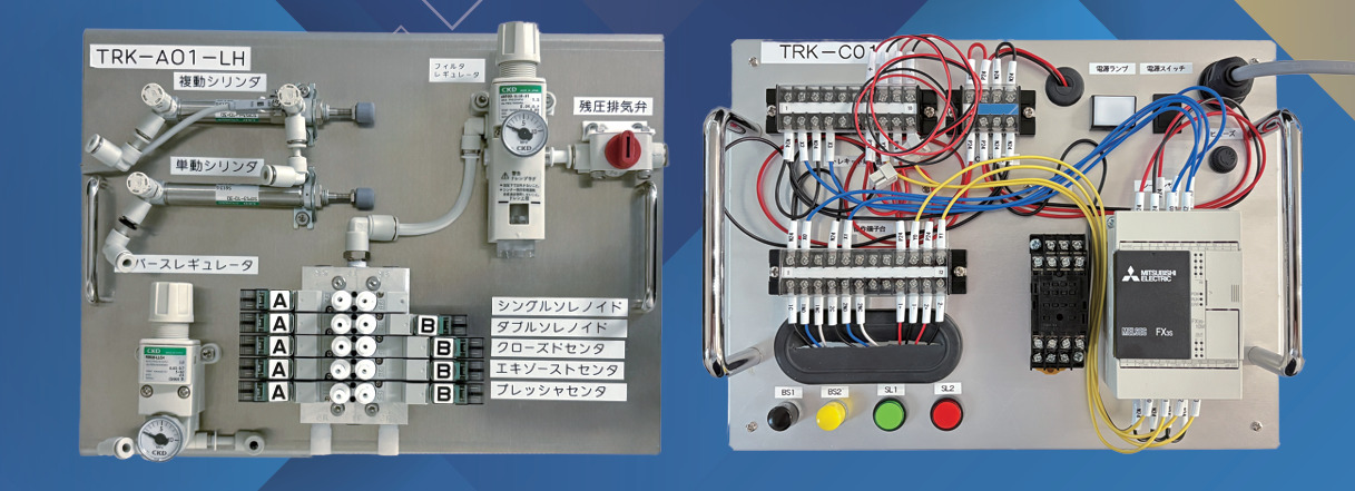 空気圧機器と電気制御の基礎がまとめて学べるトレーニングセットです。空気圧用トレキット TRK-A01-LH をベースに、空気圧の仕組みと各種コンポーネントの役割を理解し、そのまま接続して電気制御の実習に発展できます。